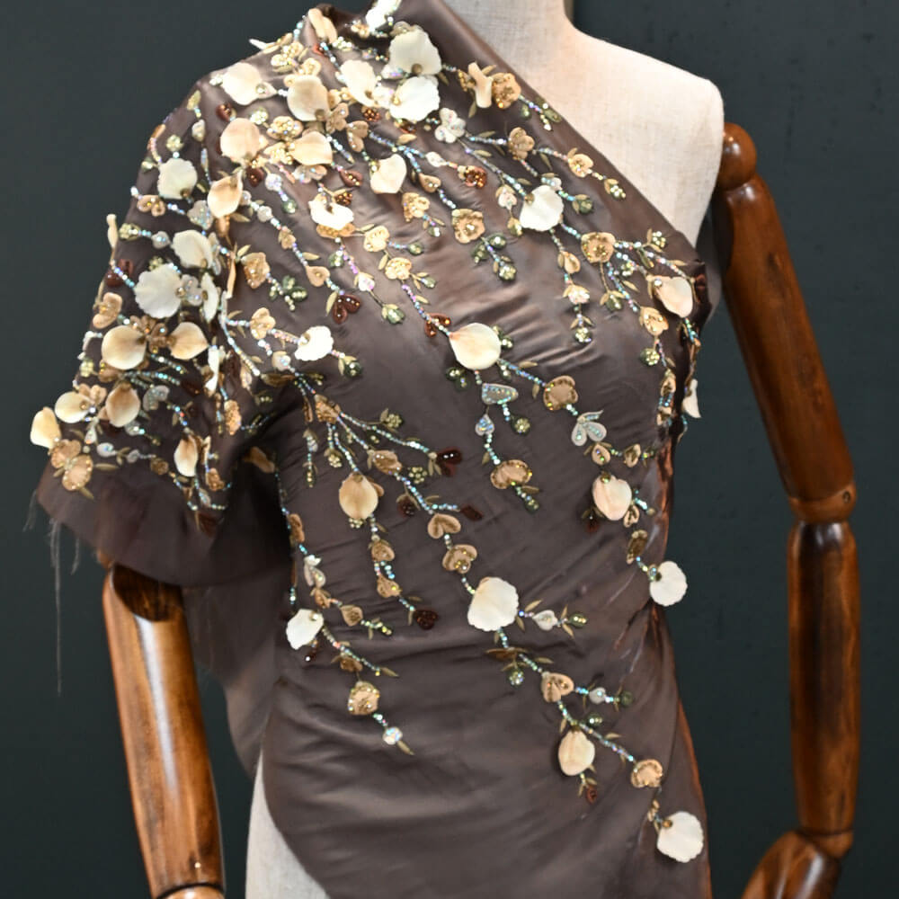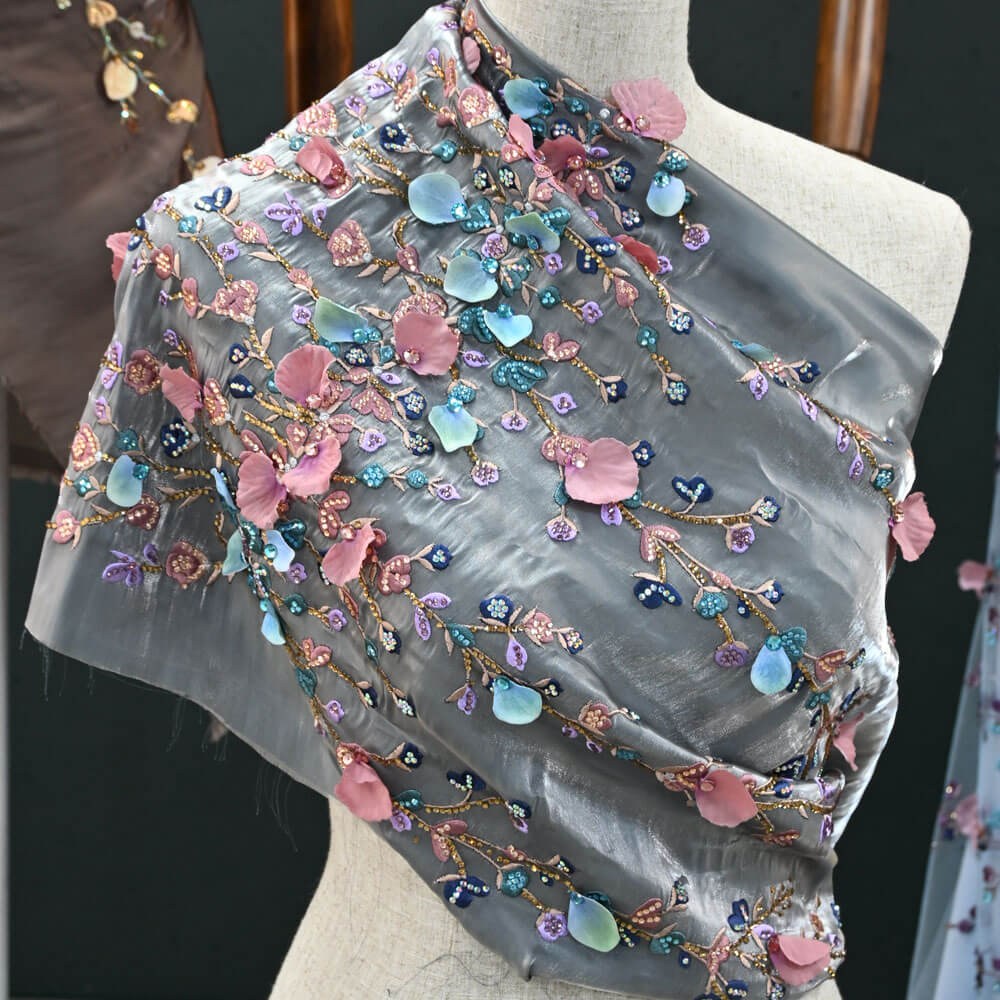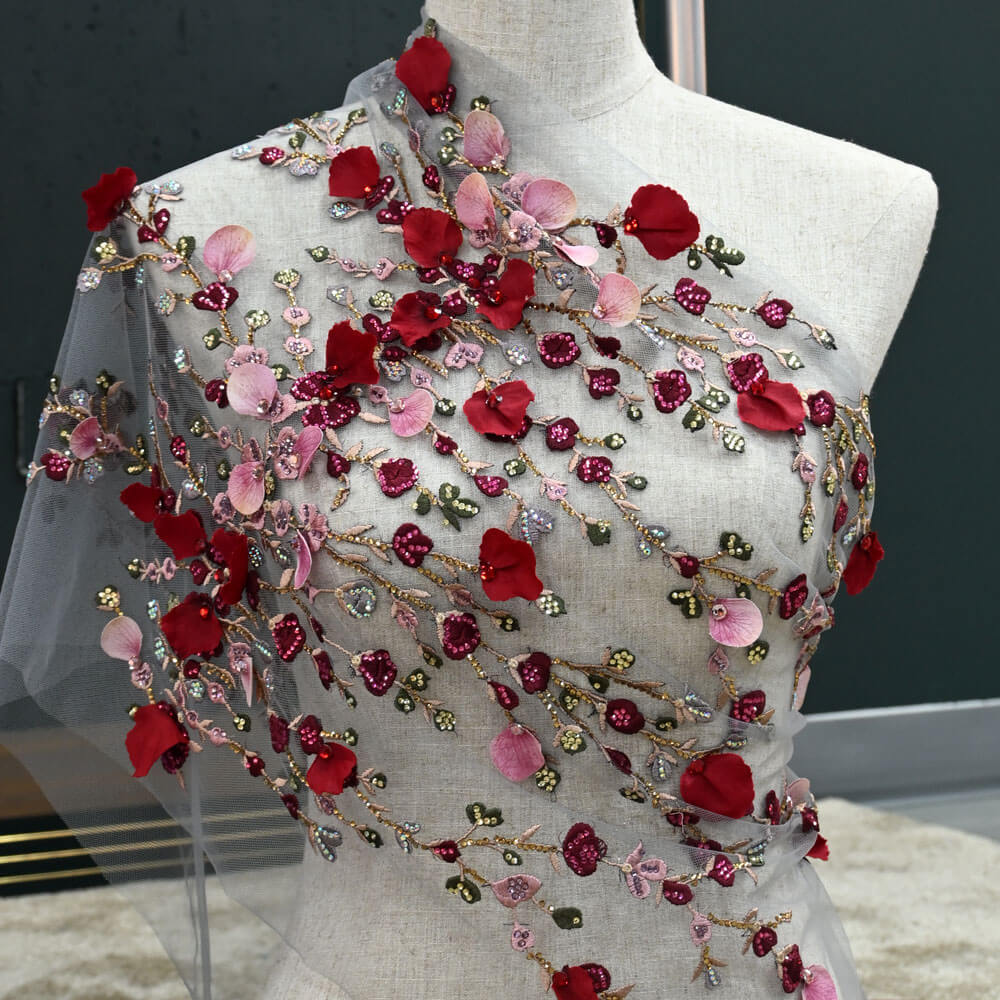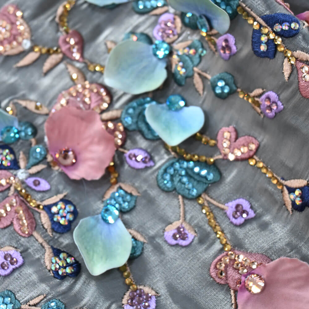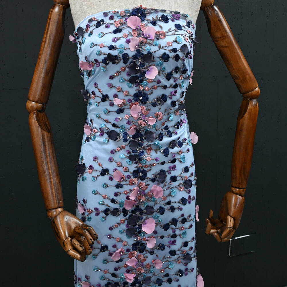 This fabric is a true work of art, designed to make every moment unforgettable. The delicate net serves as a light and elegant base, adorned with stunning 3D flowers that add depth and a lifelike charm. Each flower feels alive, crafted with care to bring dimension and beauty to the fabric. The addition of large, shimmering crystals creates a dramatic sparkle, catching light and attention effortlessly. This fabric is perfect for creating breathtaking gowns, statement outfits, or traditional wear, ensuring a look that is both bold and graceful. It embodies the perfect balance of creativity, elegance, and timeless style.