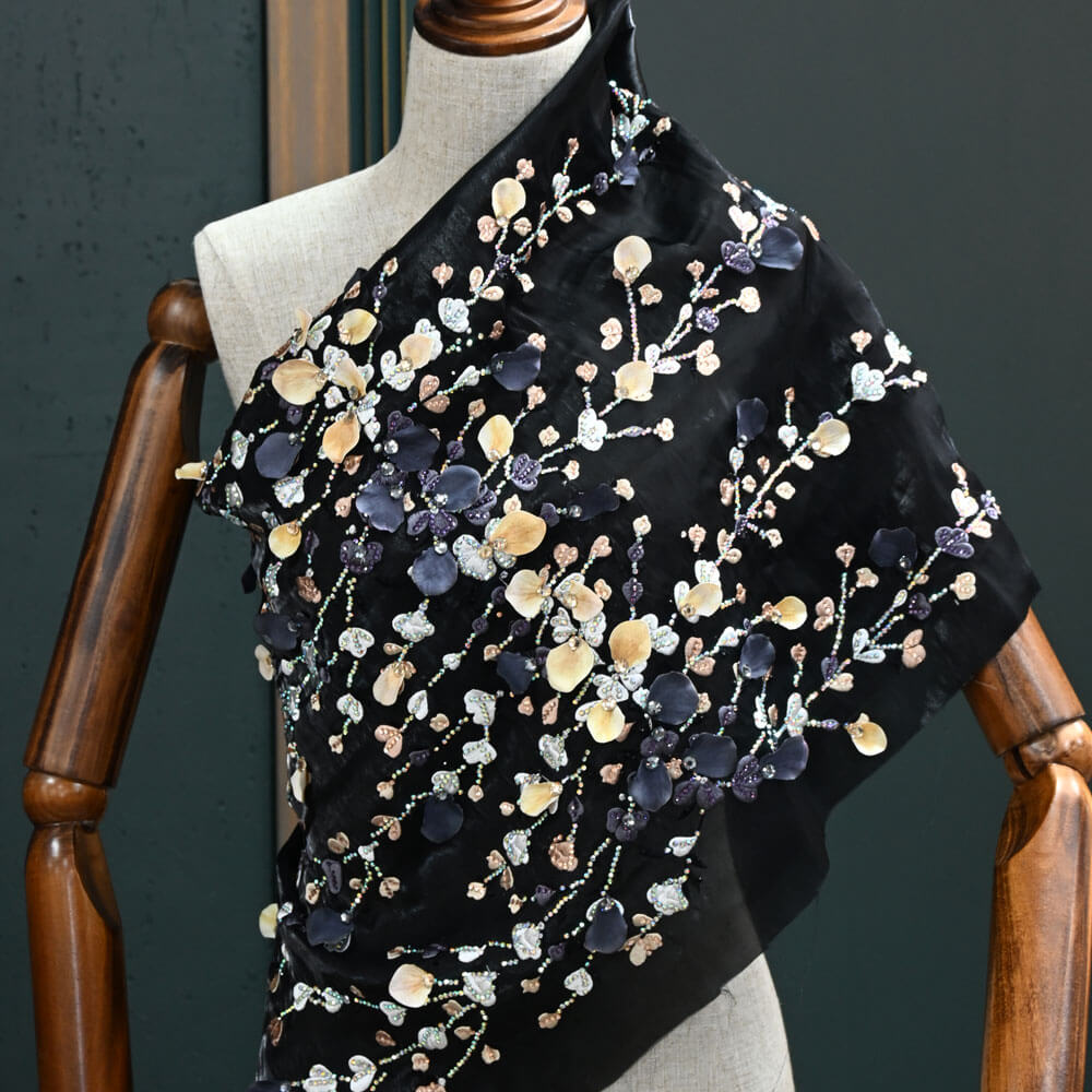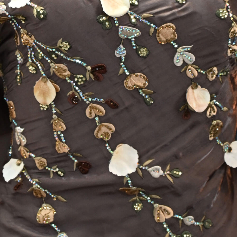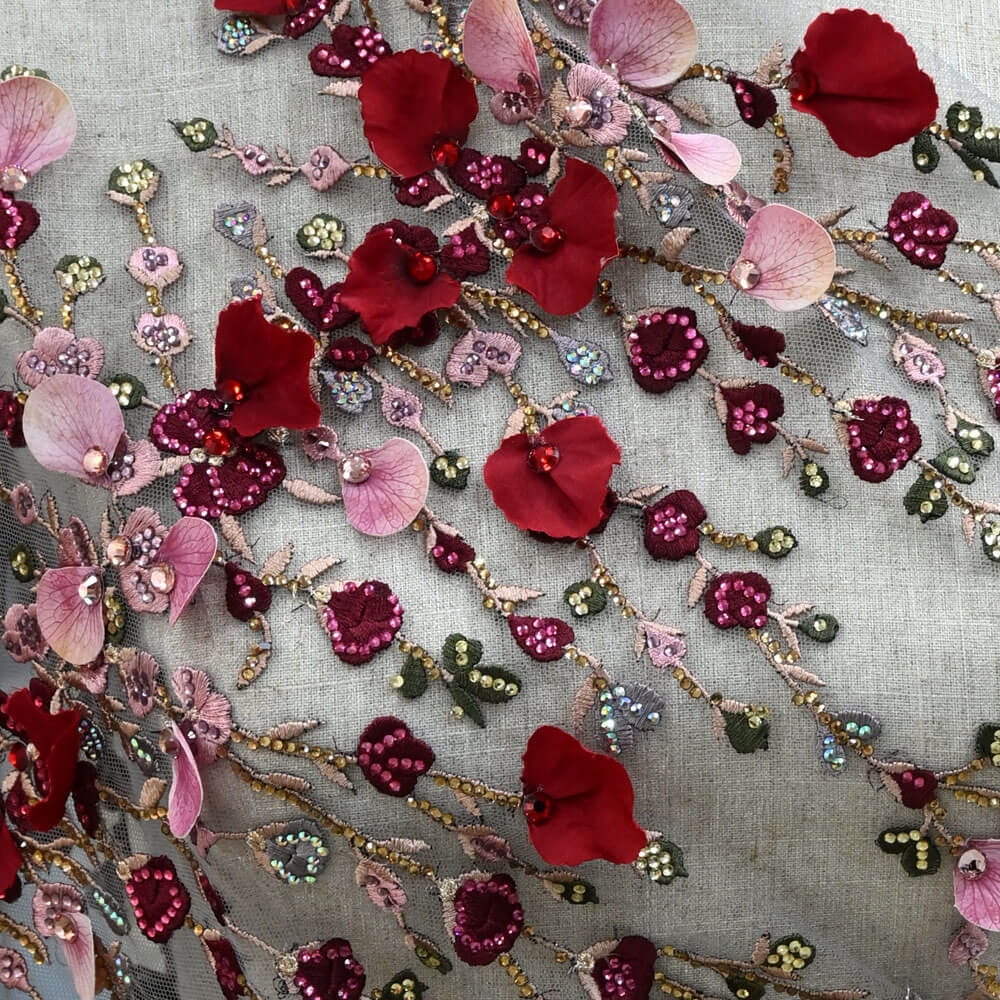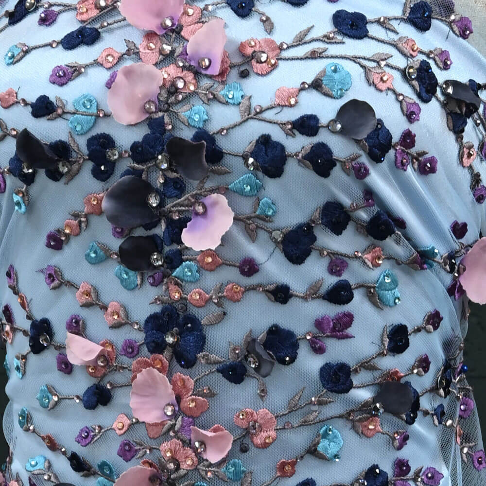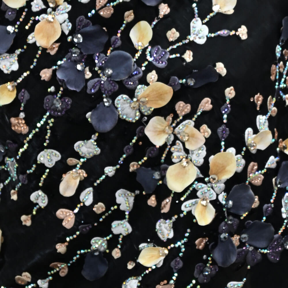 This fabric is a true work of art, designed to make every moment unforgettable. The delicate net serves as a light and elegant base, adorned with stunning 3D flowers that add depth and a lifelike charm. Each flower feels alive, crafted with care to bring dimension and beauty to the fabric. The addition of large, shimmering crystals creates a dramatic sparkle, catching light and attention effortlessly. This fabric is perfect for creating breathtaking gowns, statement outfits, or traditional wear, ensuring a look that is both bold and graceful. It embodies the perfect balance of creativity, elegance, and timeless style.
